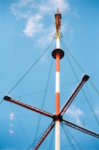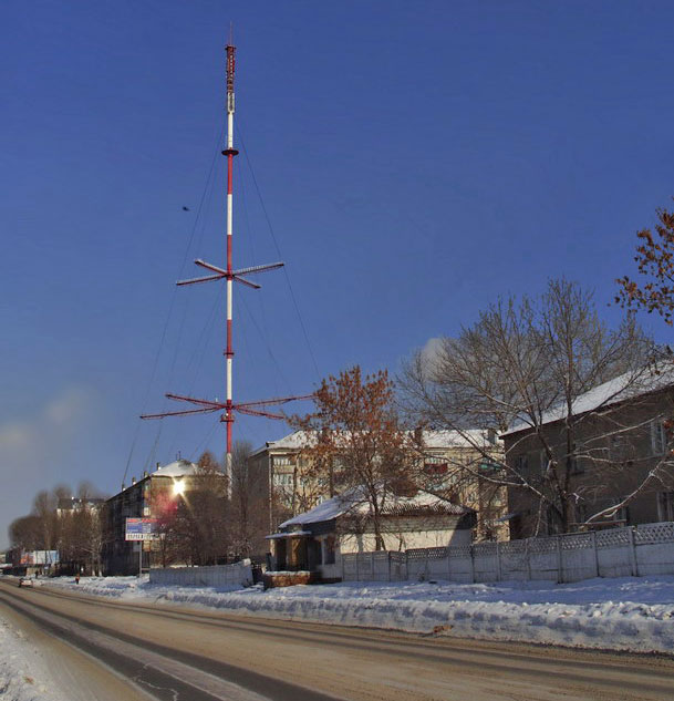 Башня Сахалинского радиотелевизионного передающего центра. Высота мачты: 183 м. В эксплуатации с 1963 года. Адрес: ул. Комсомольская, д. 211.